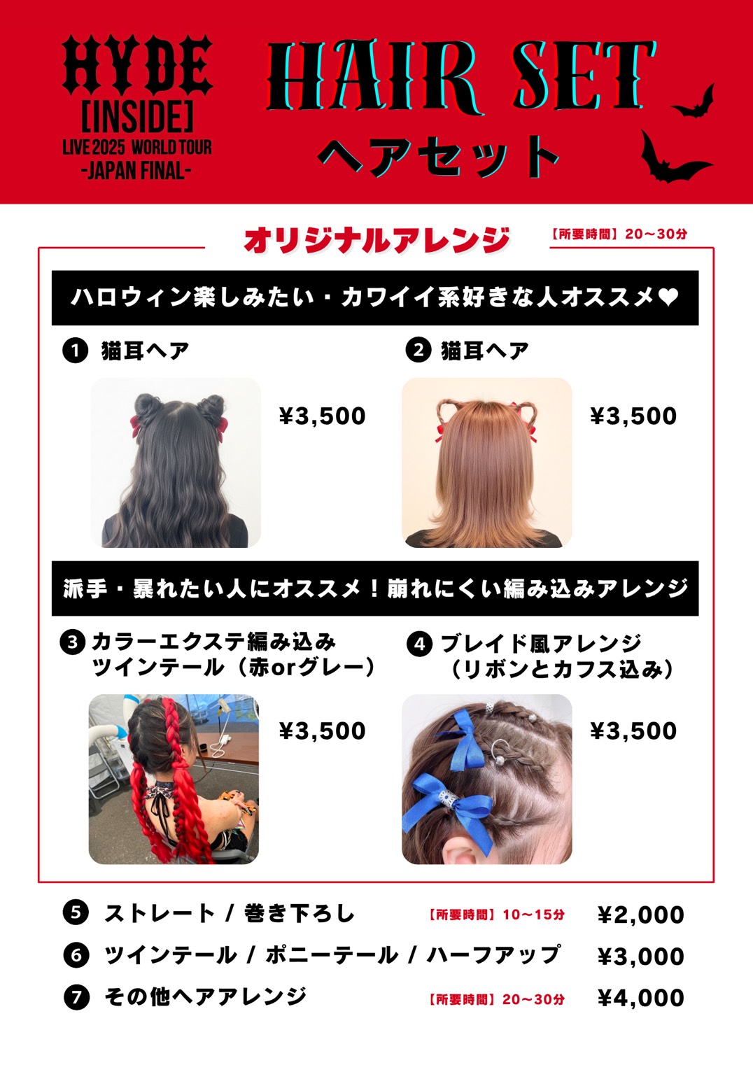 | ボディ・フェイスペイント ヘアセット | 10:00〜14:30 LIVEチケットをお持ちでなくても利用可能です。 15:00〜 LIVEチケットが必要です。 | 開演まで(予定) | イベントオリジナルデザインのペイント、HALLOWEEN気分を上げるヘアセットをご利用いただけます。当日予約制。 【料金】有料 |