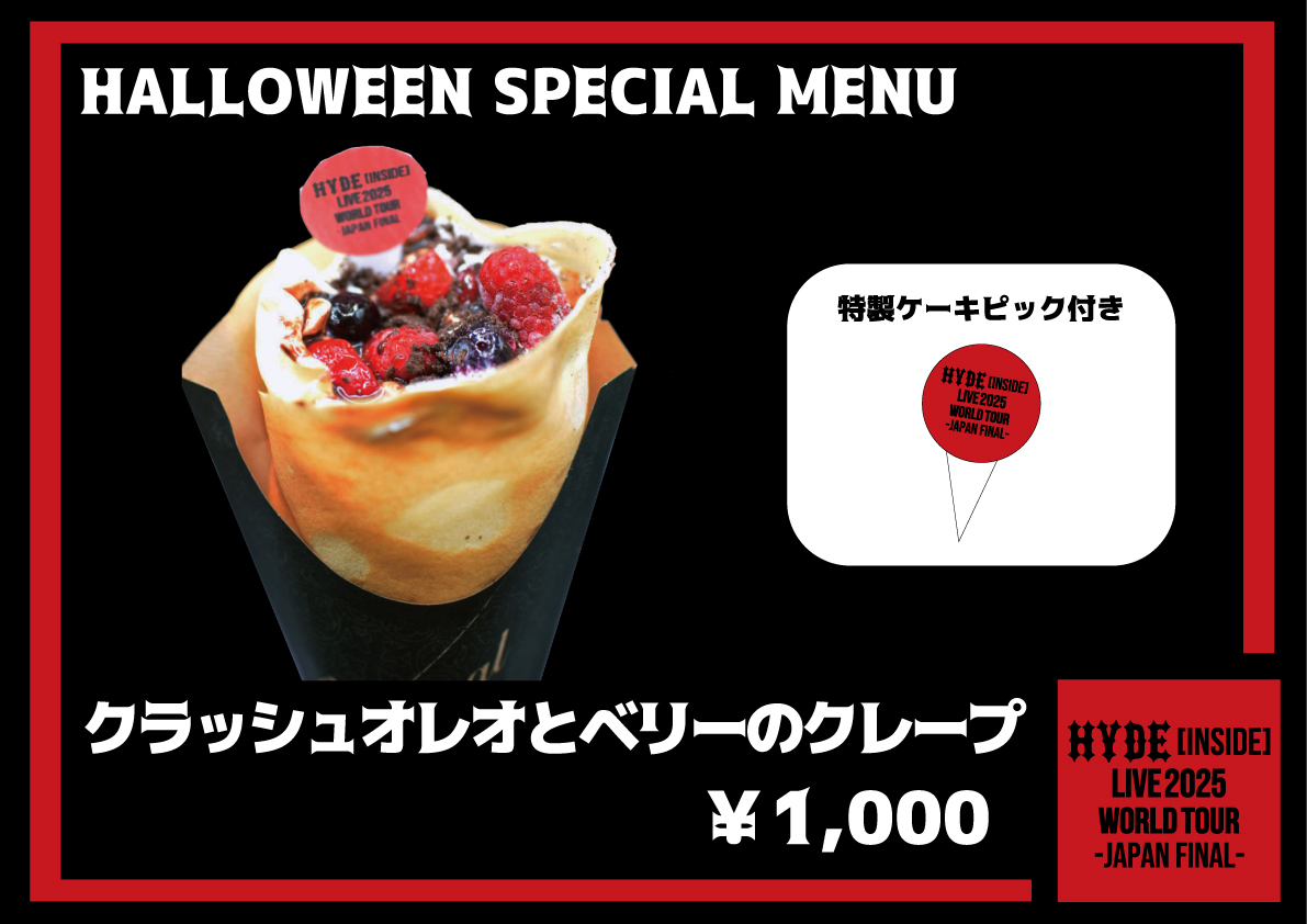 | HALLOWEEN COLLECTION | 10:00 | 14:00(予定) | 仮装をしてOFFICIAL BAR内の撮影ブースにお越しいただくと、スタッフが撮影を行います。 撮影した写真はHYDEの楽屋に貼りだしますので、直接HYDEがチェック! 仮装はワンポイントでもOKです。 ※お一人様または1グループで1枚まで撮影いたします。 ※予定数に達した場合、時間内でも撮影を終了いたします。 ※写真にメッセージは入れられません。 ※写真はお渡しできません。 【料金】無料 |